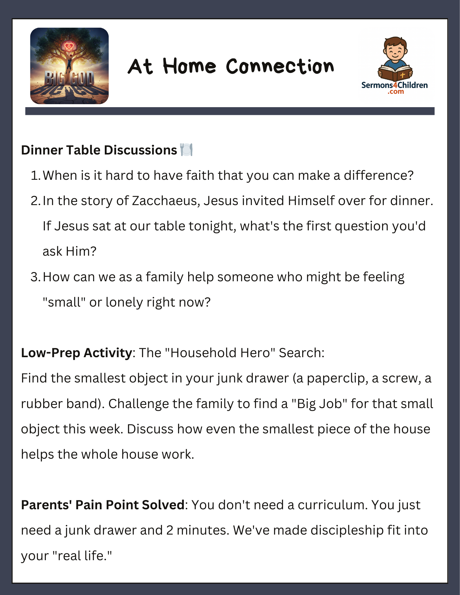 • At-Home Connection: “Dinner Table Discussions” and low-prep activities for parents to use at home.