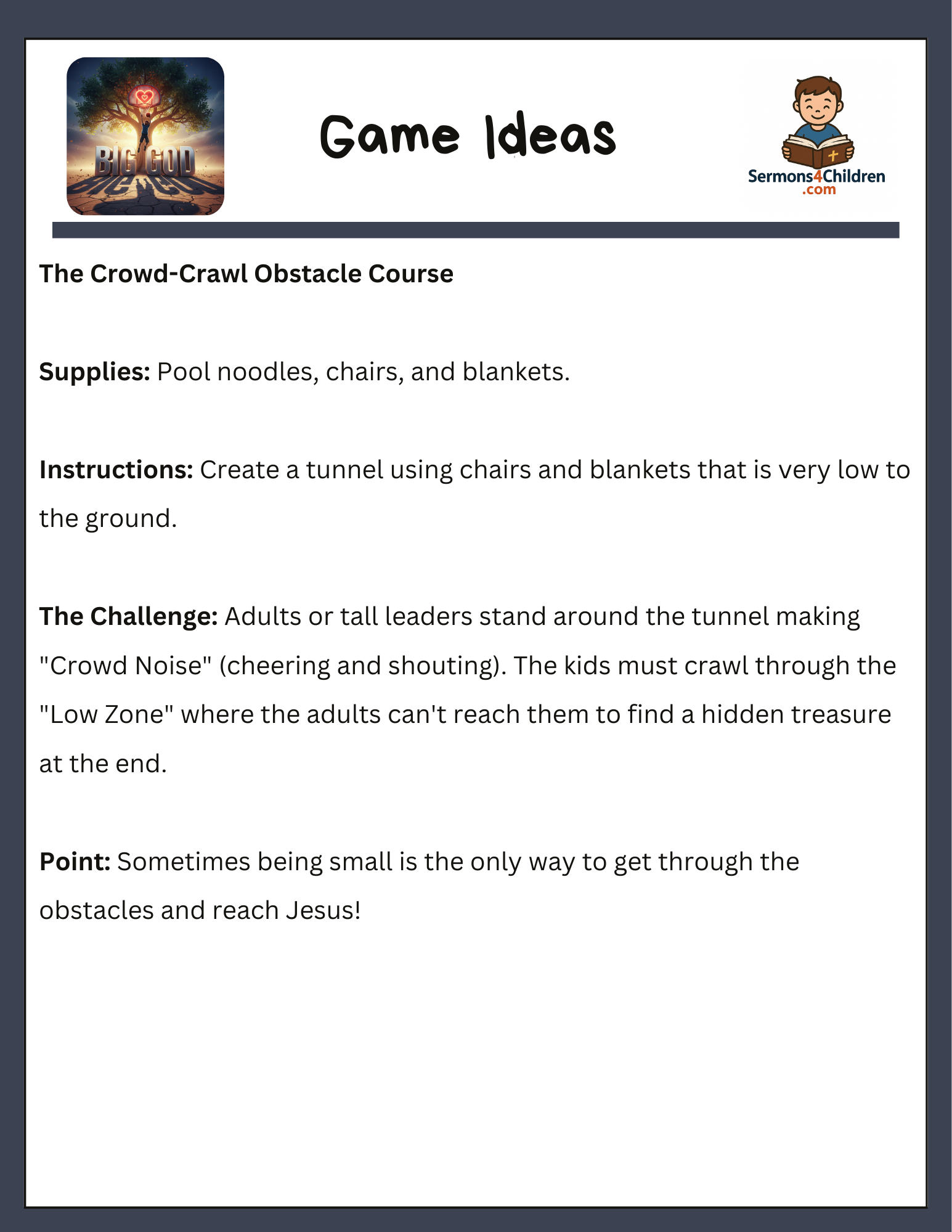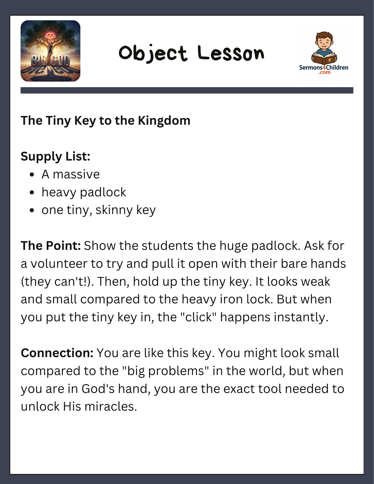 • Object Lesson: “The Tiny Key to the Kingdom” using a padlock to show how small tools unlock big miracles.