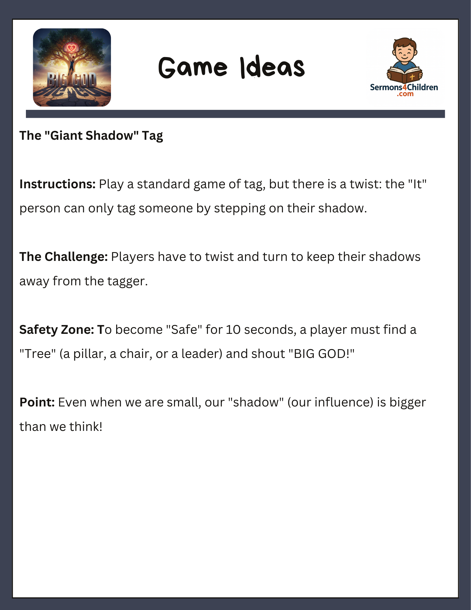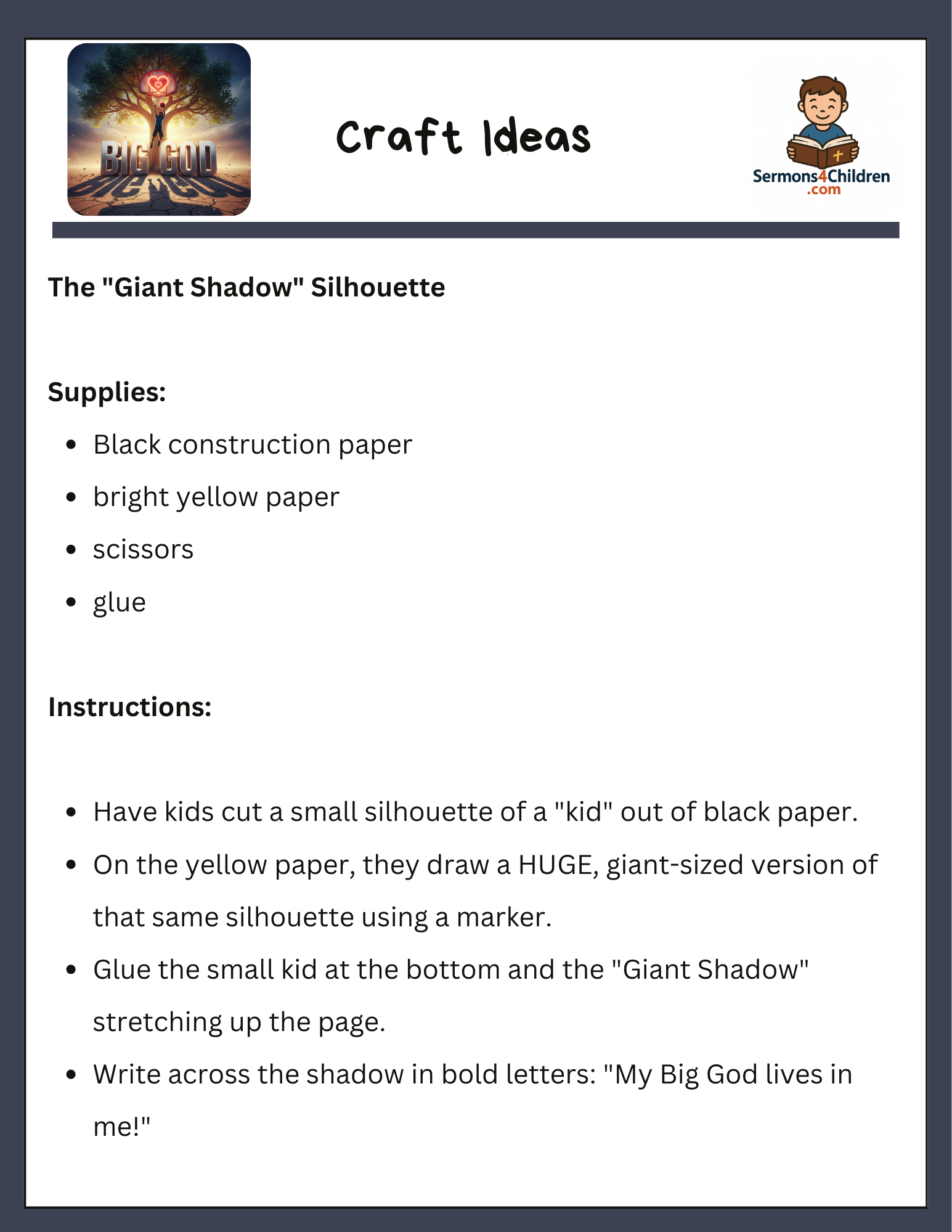 • Creative Craft: “The Giant Shadow Silhouette” to help kids visualize God’s power living in them.