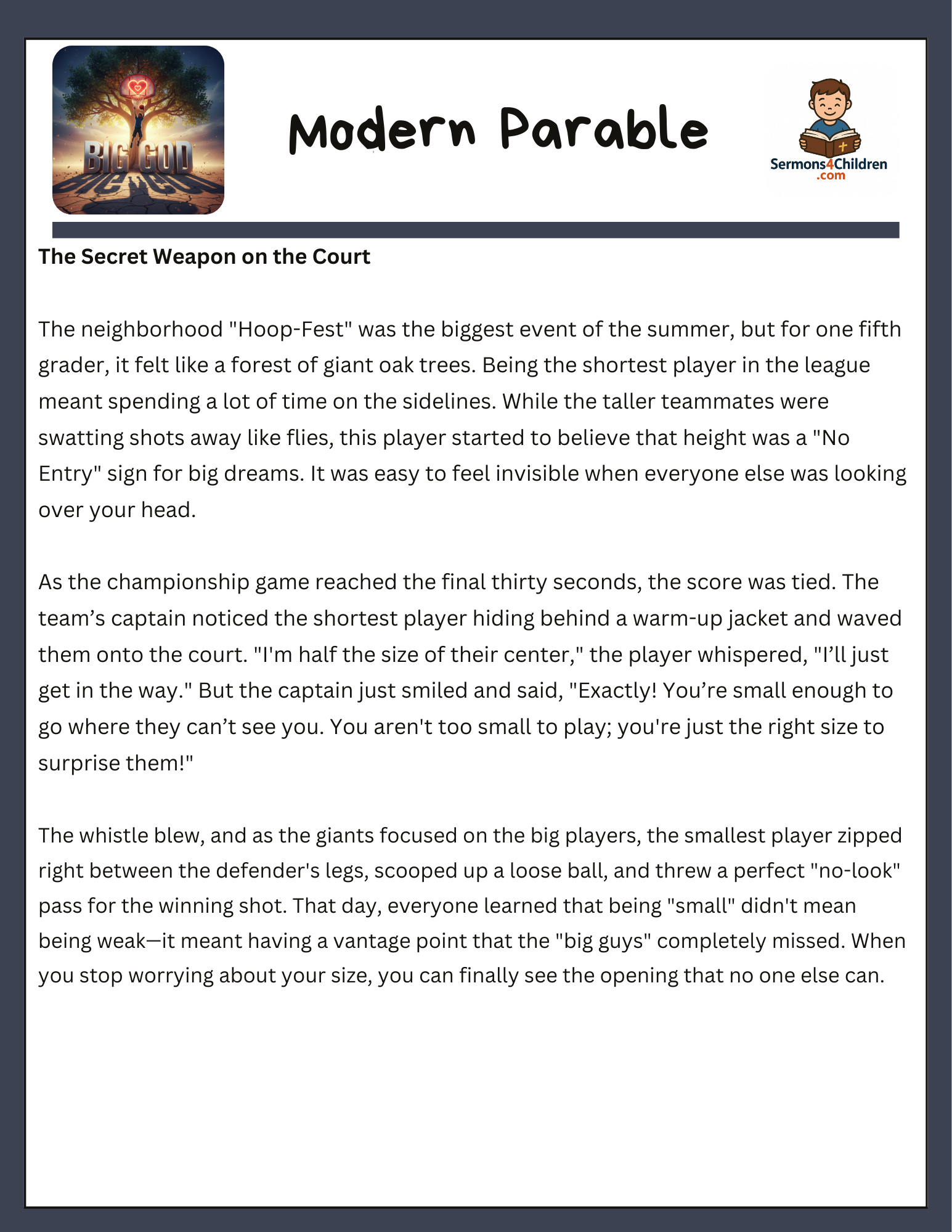 • Modern Parable: “The Secret Weapon on the Court,” a story about a 5th grader who discovers that being small is an advantage.