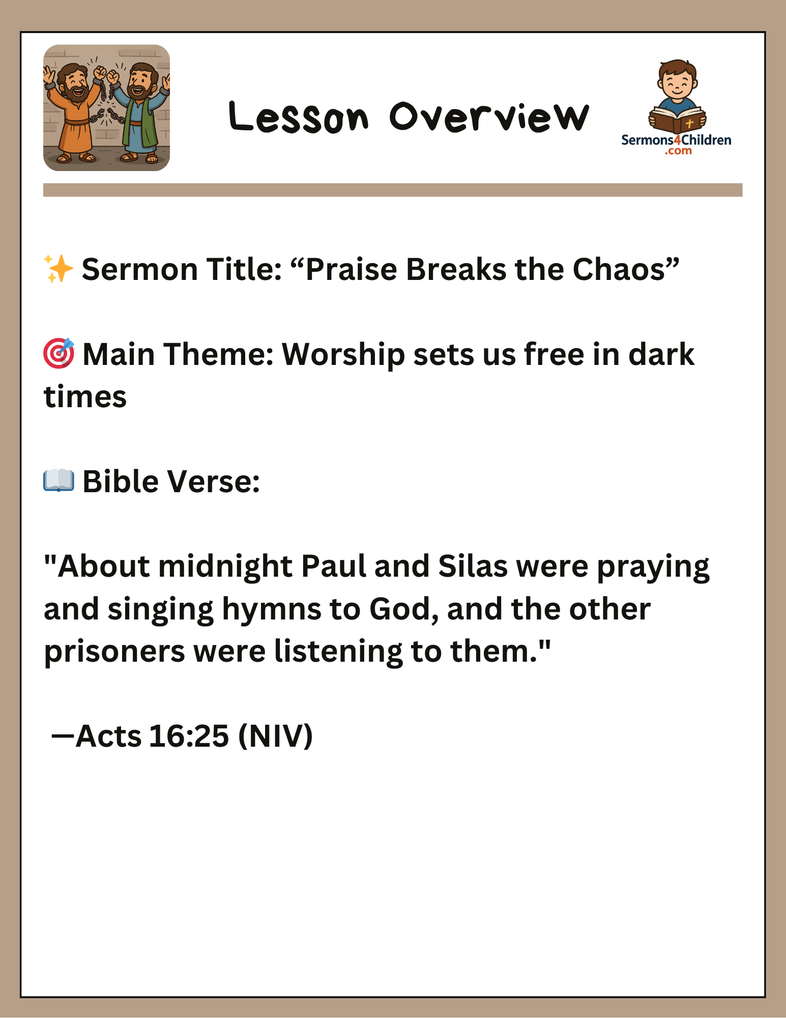Teach kids the power of worship with “Praise Breaks the Chaos,” a dynamic children’s sermon based on Acts 16:25. This engaging lesson uses the story of Paul and Silas in jail to show that praising God—even in hard times—brings freedom and peace. Includes a powerful object lesson, fun games, a true modern-day story, 10 Q&As, and themed crafts and activities. Perfect for Sunday School, VBS, or children’s church!