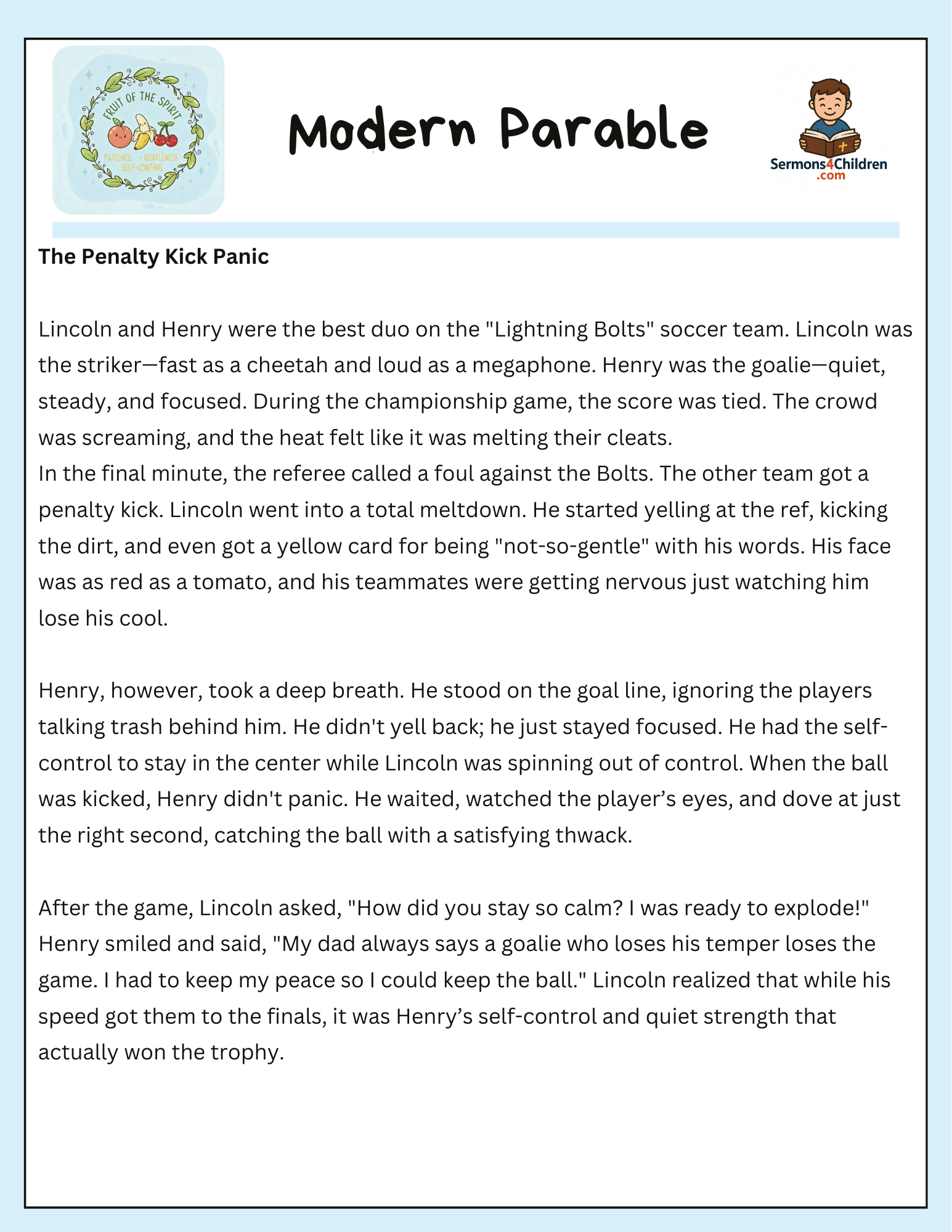 • Modern-Day Parable: “The Penalty Kick Panic,” a story about two soccer players discovering the value of quiet strength.