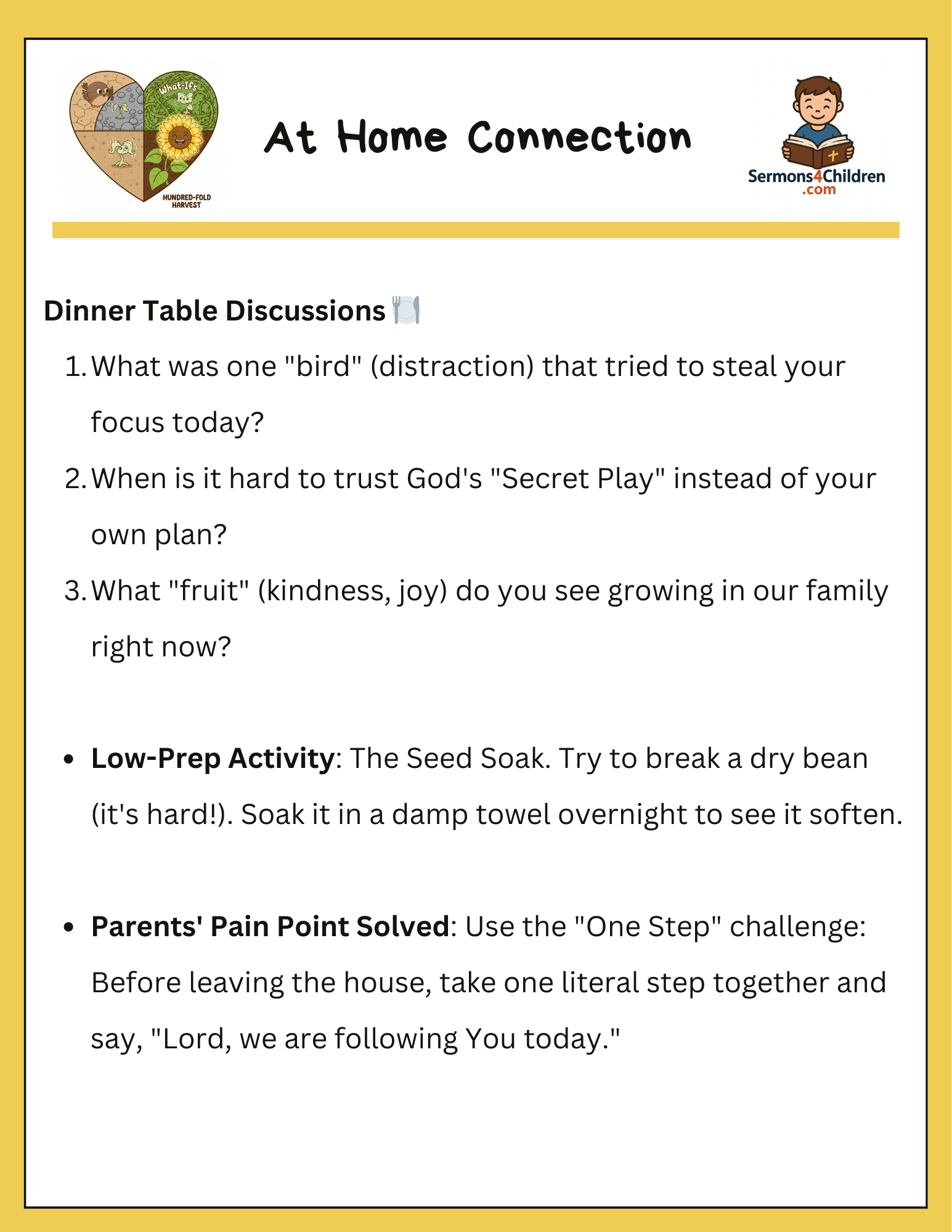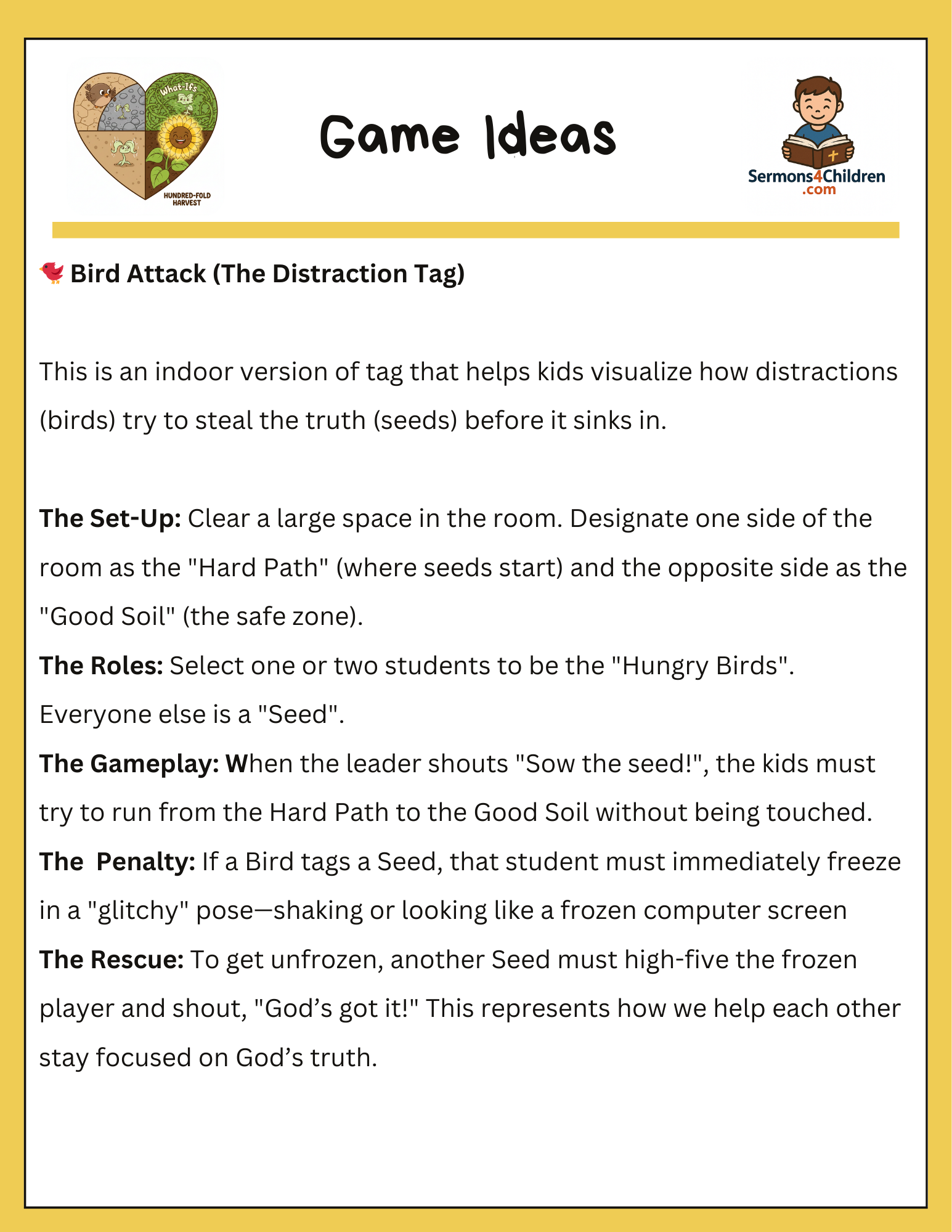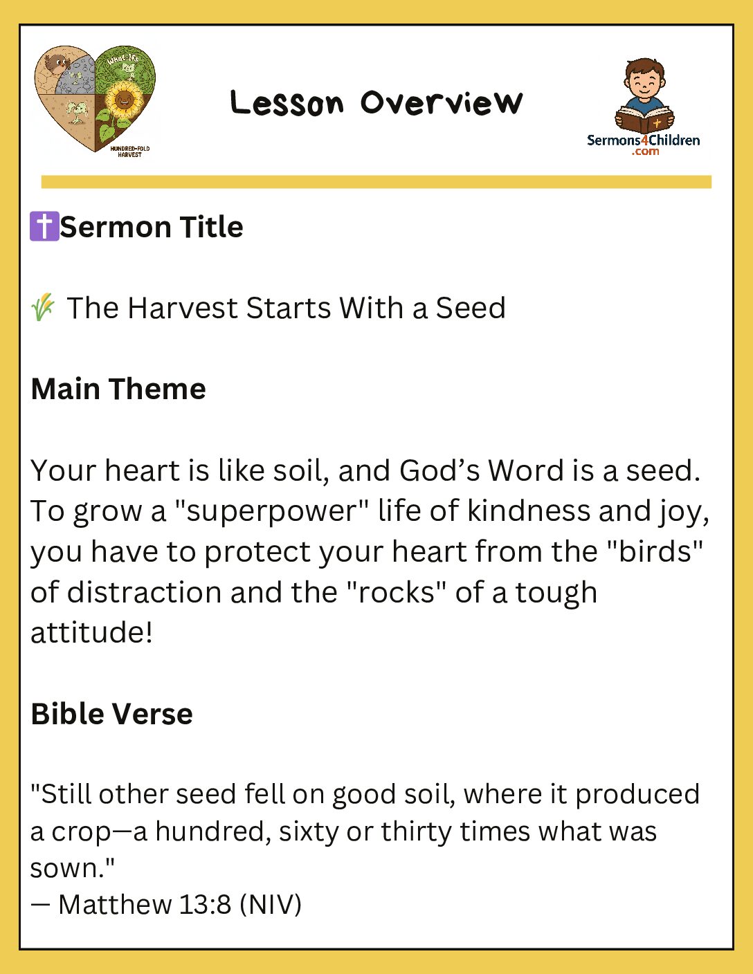 Help kids discover how to become “the boss of their soil” with this engaging lesson based on the Parable of the Sower (Matthew 13:1-23). This pack uses modern analogies—like TikTok distractions and dodgeball strategies—to teach children how to protect their hearts from the “birds” of distraction and the “rocks” of fear.