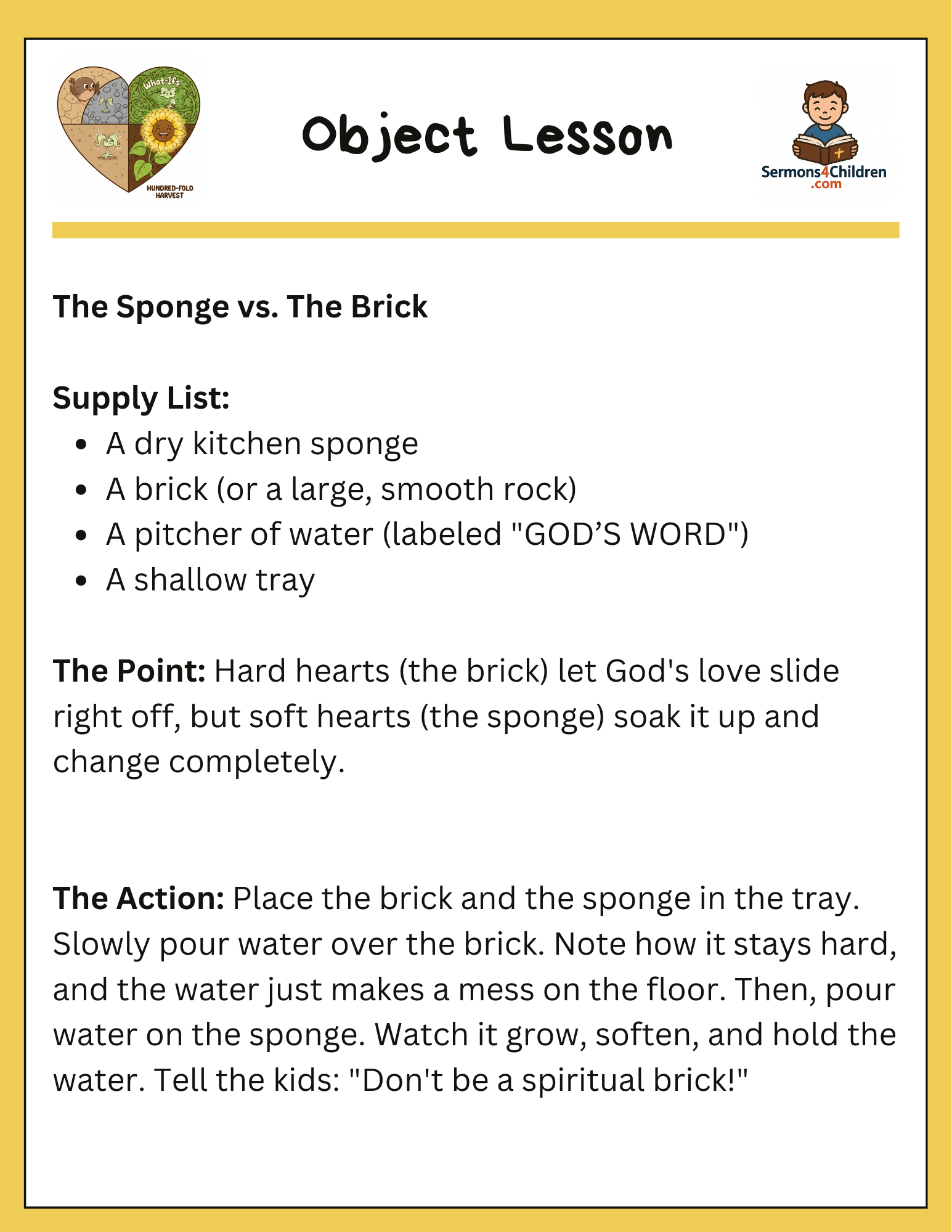 • Object Lesson: “The Sponge vs. The Brick”—a visual demonstration of how soft hearts soak up God’s Word.